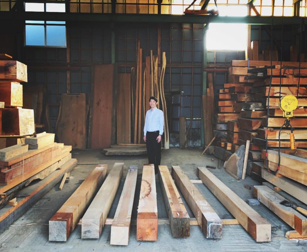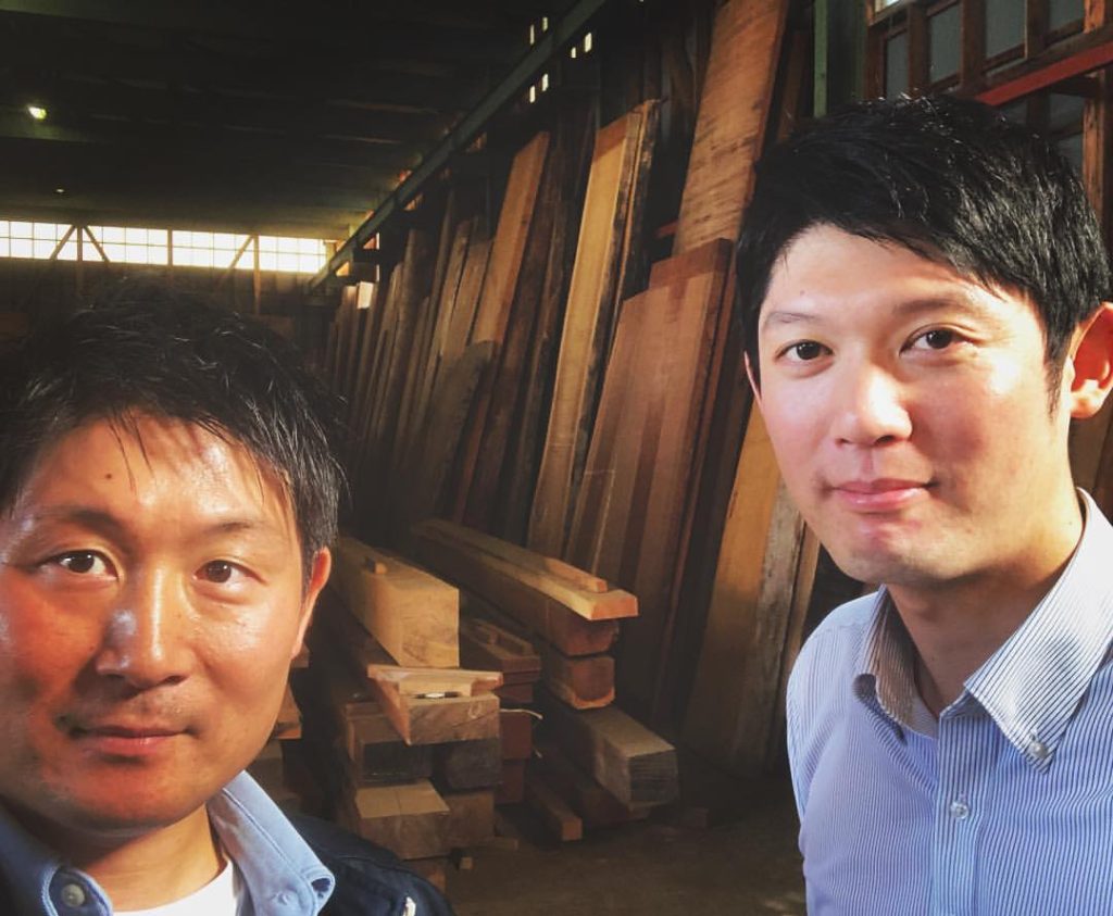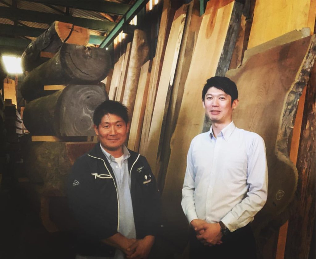 店主であり中小企業診断士でもある比企さん、今日はお仕事で来ていただいたついでに木材見学で案内させていただきました。